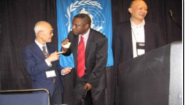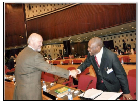 The Algerian UNESCO Representative extends a congratulatory handshake to Prof. Inyang at the RIO+20 United Nations Summit Preparatory Meeting in Addis Ababa, Ethiopia on October 24, 2011.
