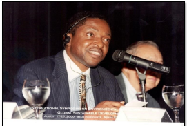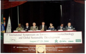 At the closure of the Global Infrastructure Development & Environmental Sustainability Conference in Brazil, Prof. Inyang as ISEG President addresses the press. Seated to his left is Prof. H-Y Fang, Chair of the Board of Trustees of ISEG, Belo Horizonte, Brazil, August 17, 2000.