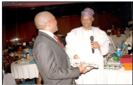 Prof. Inyang is fetted at a ceremony at Abuja’s Transcorp Hilton Hotel after receiving Nigeria’s highest award for intellectual contributions- the NNOM in Engineering and Technology. Handing over a gift to Prof. Inyang is Prof. Adegoke- the Chairman of the Board of the NNOM, Abuja, Nigeria, December 5, 2013