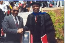 Prof. Inyang is congratulated by Dr. Kermit DeGraffenreidt in Lowell, Massachusetts, USA after he received the 1999 Chancellors Medal for Public Service presented to him during commencement, , Lowell, Massachusetts, USA, 1999.